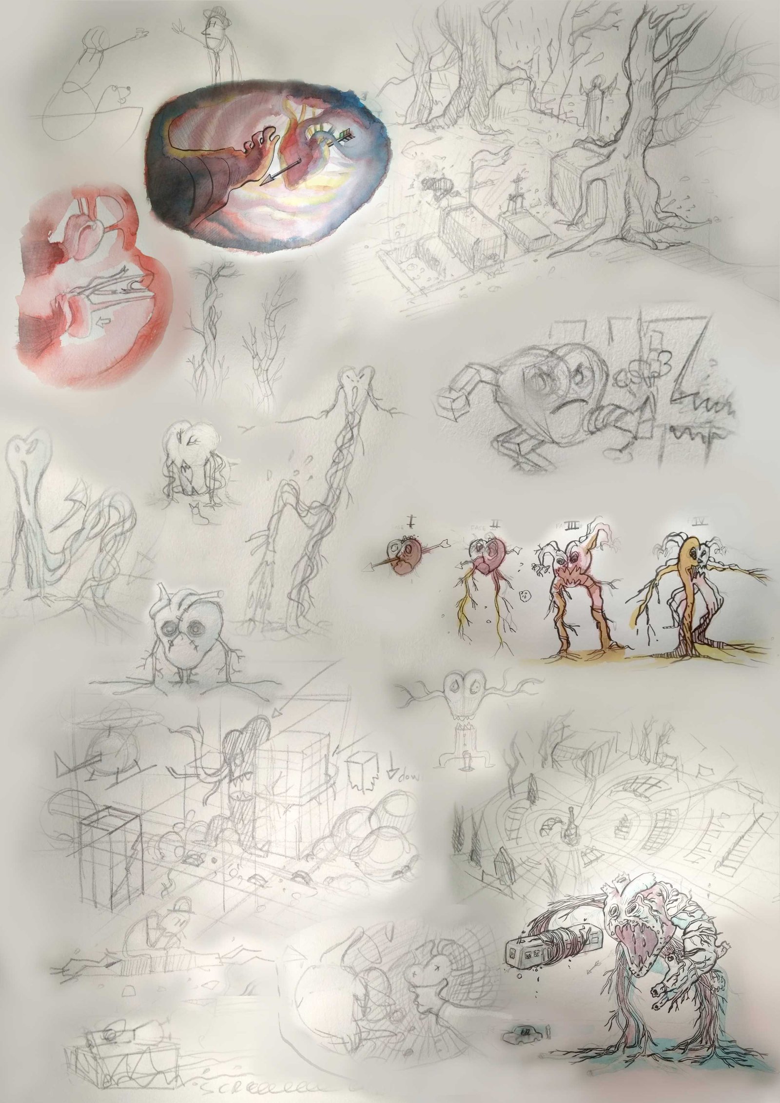 Here you will find a tour of some of Hurty’s pre-production designs, such as the storyboard and various concept drawings that defined some of the characters, such as the heart monster.